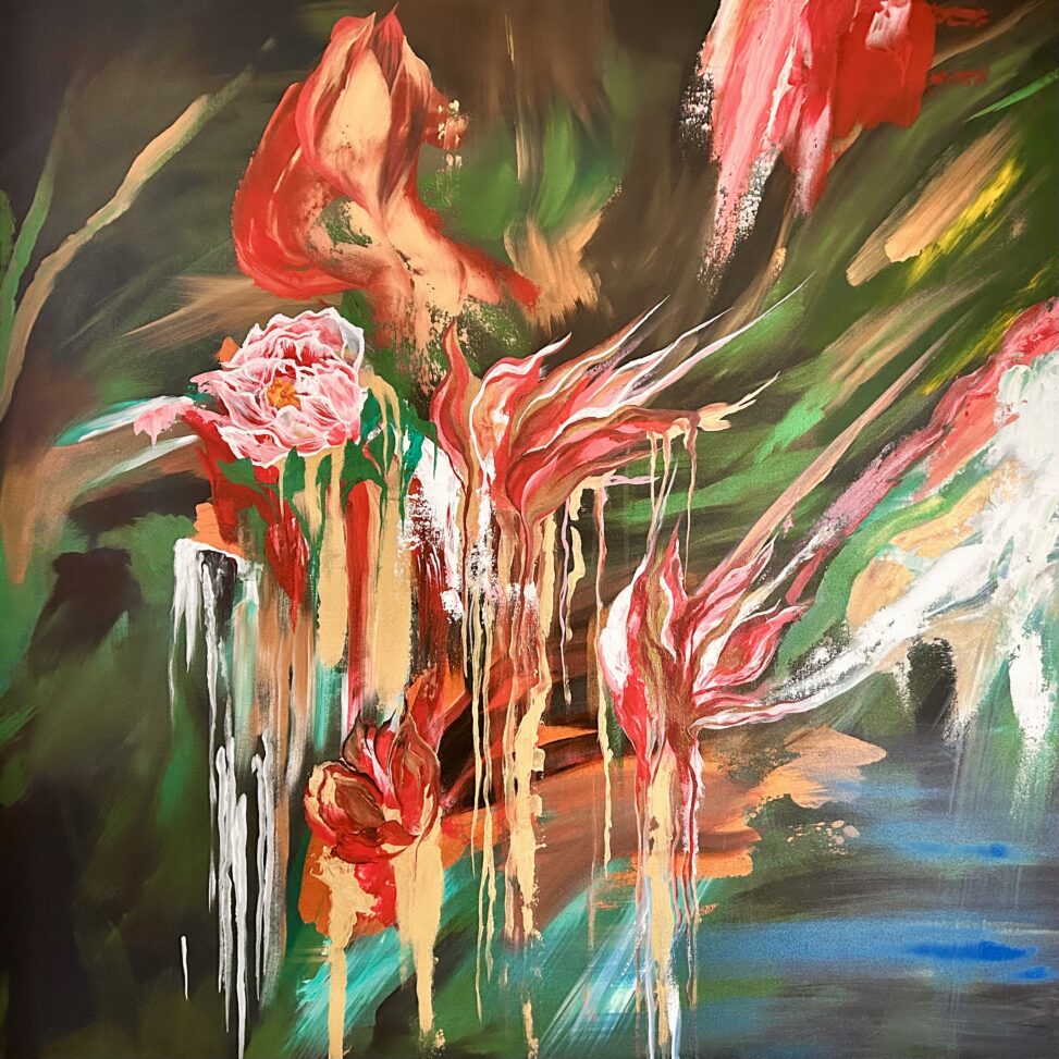 This painting has several flowers we all love. Peonies, Fire Lilies, and Tulips. Each flower has their own meaning. Peonies are for romance, prosperity and happy marriages. Fire Lilies symbolizes passion, pride, resilience, and transformation. Tulips are for deep love, rebirth, and new beginnings.